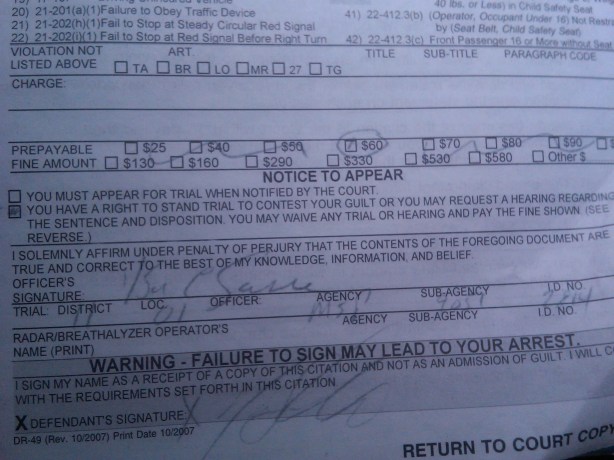 I let him run through his spiel about the ticket and fine and right to go to court, and when he was finished, he asked if I had any questions.