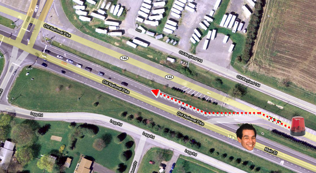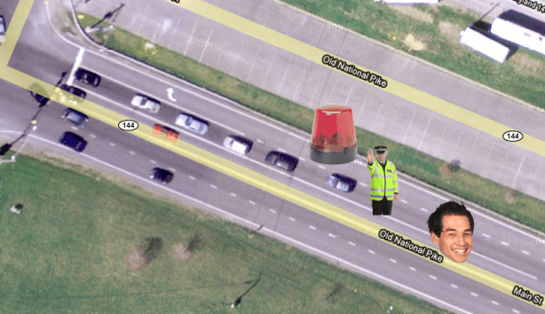 Moments later, the “Commander” pulled out from behind the trees and zoomed ahead in the right hand lane that would ordinarily spit him out onto I-70 going eastbound.