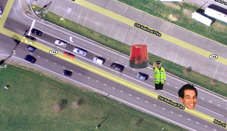 Officer Sasse had parked his car and gotten out of his vehicle to start waving cars, one-by-one, through the traffic light. When he got to my car, he pointed at me with his accusing finger and waved me to pull over behind his car.